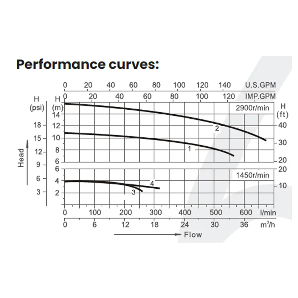 The pump's performance curve demonstrates consistent flow rates across various head pressures, making it suitable for both circulation and massage functions in spa systems. With a maximum working pressure of 0.3MPa, this pump ensures safe and effective water management.